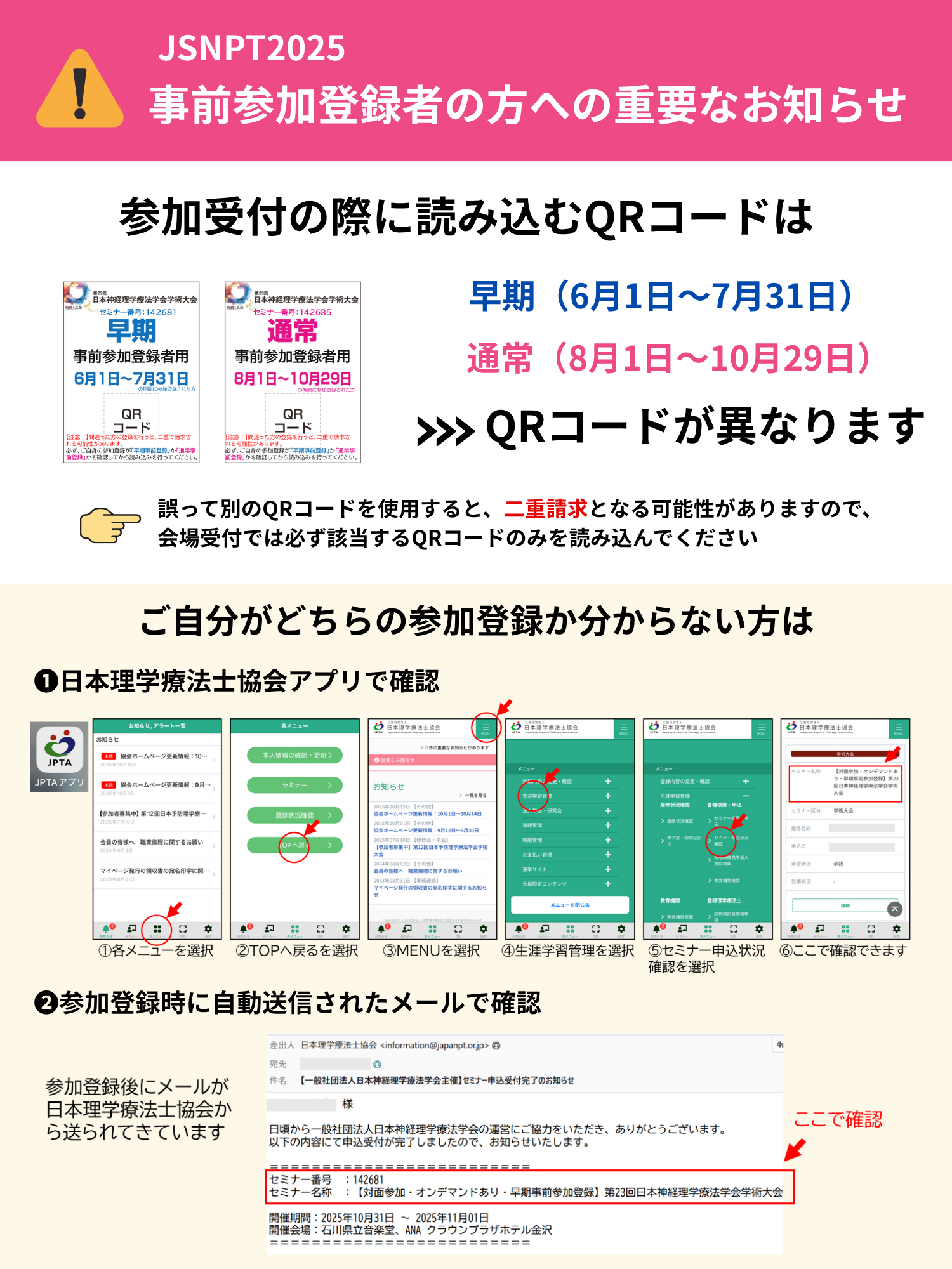 本大会の参加受付は、例年通りスマートフォンのJPTAアプリからQRコードを読み込む方式となっております。 ただし、「事前早期参加登録」と「事前通常参加登録」ではQRコードが異なります。誤って別のQRコードを使用すると、二重請求となる可能性がありますので、会場受付では必ず該当するQRコードのみを読み込んでください。